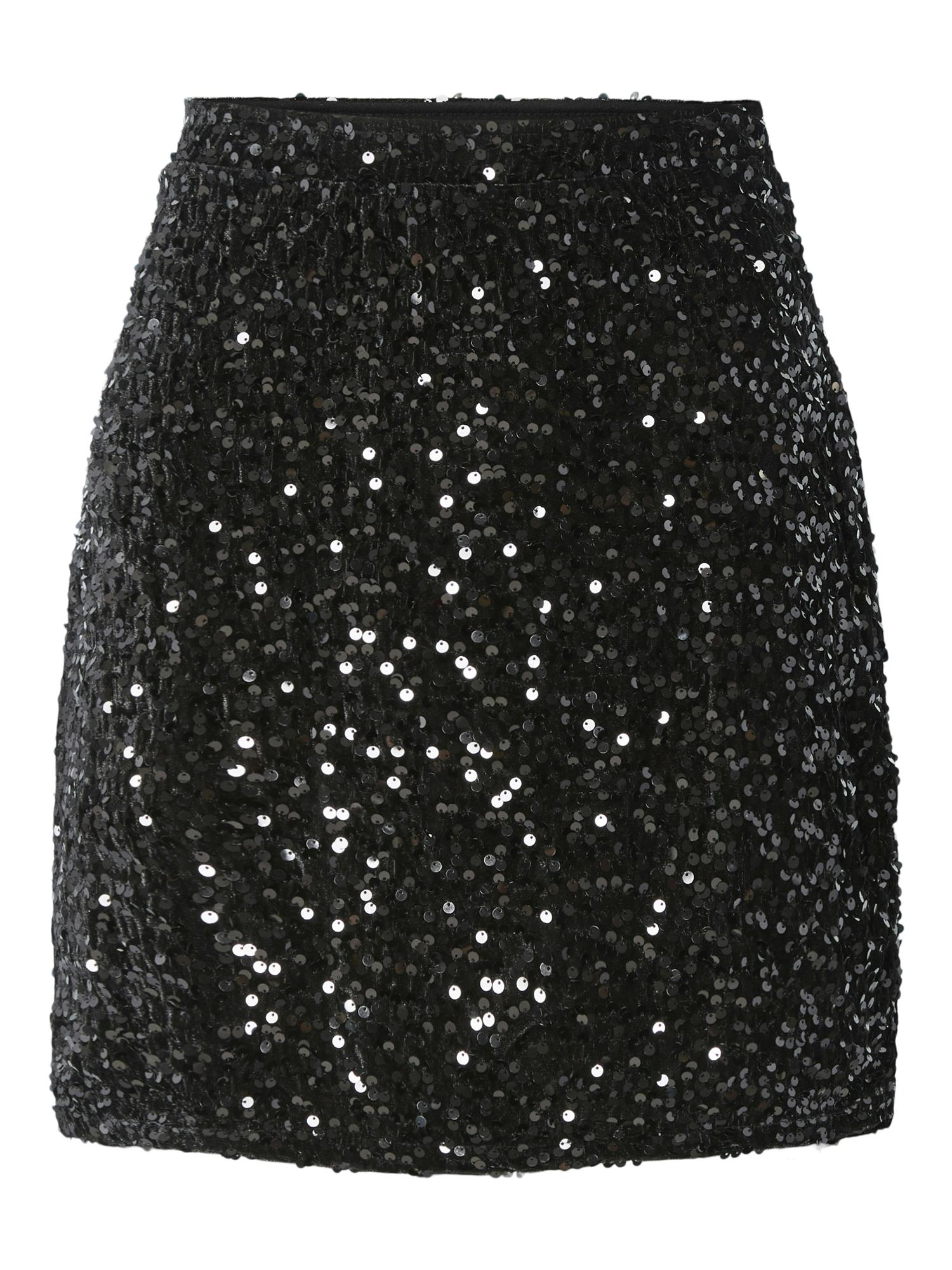 Ett kort paljettskjørt med høyt liv, og mye stratch.